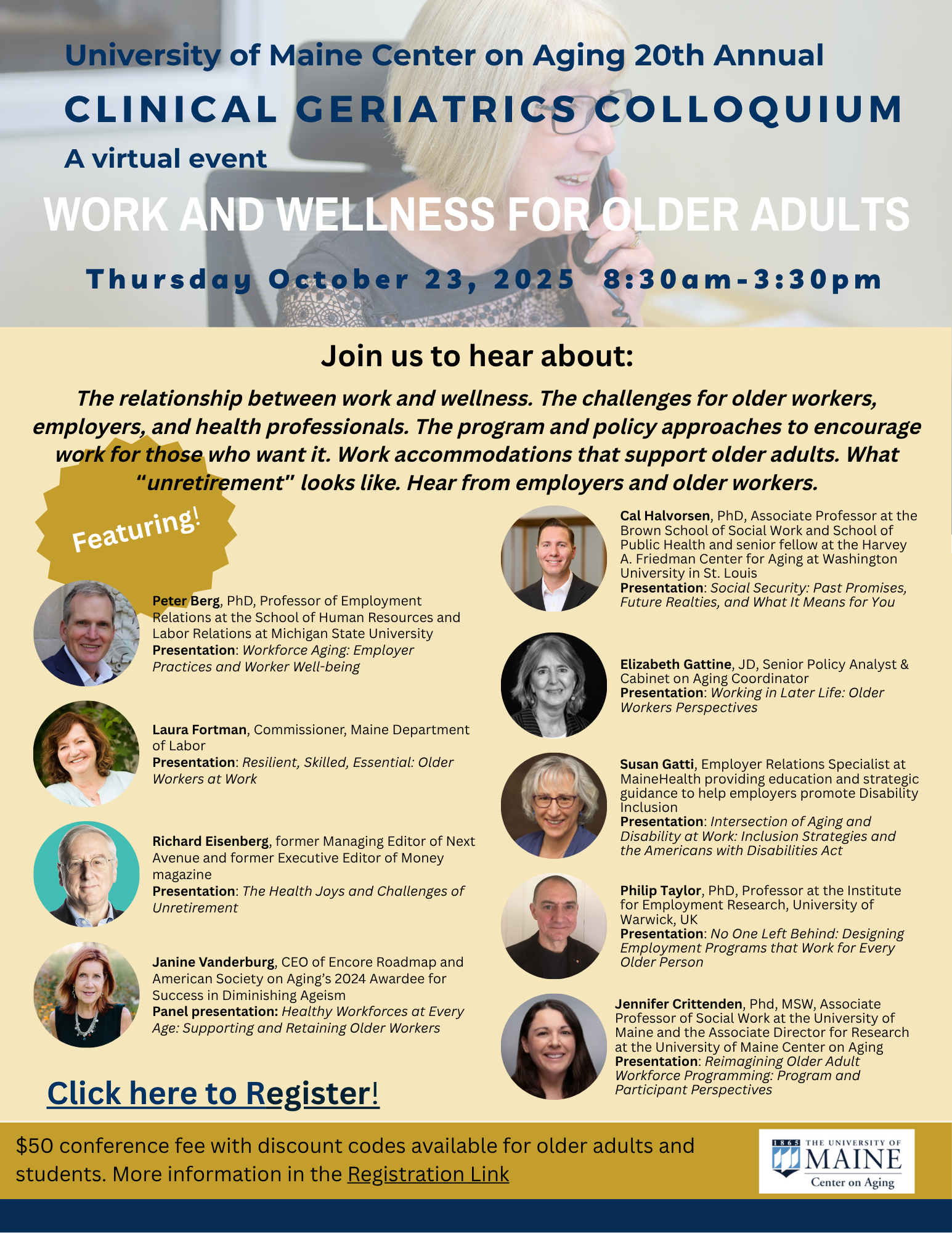 If you are looking for the 2024 Annual Clinical Geriatrics Colloquium Session Videos click here: https://mainecenteronaging.umaine.edu/6274-2/